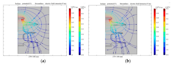 When the polluted post insulator encounters rainfall, rain drops collide with the insulator sheds, causing severe deformation while wetting the surface contamination layer. Concurrently, due to the excellent hydrophobicity of composite material [20], rainwater usually exists on the surface in the form of dispersed water-droplets in the beginning. With the continuous supplement of rainwater, continuous water-flow forms on the shed gradually, as well as many suspended water-droplets on the edge of shed because of inclination and gravity. These suspended water-droplets, which modify the electric field distribution along the insulator surface, are usually distributed in the periphery of the sheds. According to the electric field simulation model established in Figure 3, the electric field intensity and potential distribution around the sheds and water-drops were simulated. Figure 4 illustrates the results of a typical electric field distribution of the model.