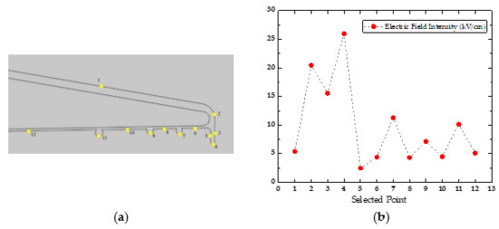 Values of electric field intensity of some selected points on the shed surface in the model with water-film and water-drops. (a) selected points on shed surface; (b) values of electric field intensity of the selected points.