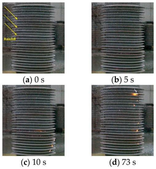 - In the vertical direction, the drifting arc discharges initiated from suspended water-drops on one side, which connected together to form a larger arc bridging multiple groups of sheds, as shown in Figure 7e. This greatly reduced the insulation performance of the whole insulator, and flashover occurred suddenly. In the rain flashover of the polluted large-diameter post insulator, there was no obvious creepage process of the arc along the insulation surface, which was different from the traditional pollution flashover of suspended insulators. The flashover was caused by the sudden connection of series of small arcs between multiple sheds.