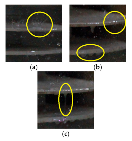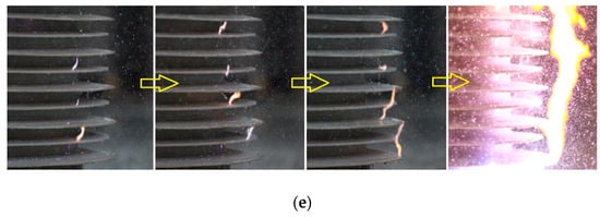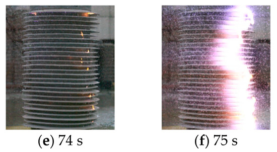 - Discharges first take place in the form of corona around the discrete water-droplets on the upper sheds. As mentioned above, the existence of these water-droplets is due to the good hydrophobicity of the materials. Previous studies have shown that the maximum electric field strength of the water-droplets on the upper shed appears at the interface between the liquid and the shed surface, where air is ionized [3,4,5,6,7,8,9,10,11,12,13,14]. These corona discharges did not further develop into an arc, because the shape of the water-droplets on the upper shed did not change significantly, resulting in no further distortion of the electric field intensity around the water-droplets. Most of these corona discharges looked blue or purple, as shown in Figure 7a.