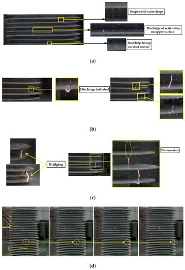 - With the increase of the time or intensity of rainfall, the water-flow on the surface was accelerated and enhanced, which lead to a rapid increase of volume and gravity of the suspended water-drop. Consequently, a stable shape was difficult to maintain. When the suspended water-droplet was elongated, discharge at the apex developed from streamer to an obvious arc, which was mostly yellow or orange, as shown in Figure 7c. If the distance between insulator sheds was not large enough, a water-curtain bridged the adjacent sheds, which made the creepage distance invalided so as to reduce the flashover voltage of the whole insulator.