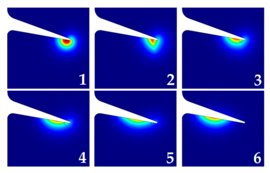 Figure 10. Simulation of a movement of “reciprocating” of a suspended water-drop. - T-IV: Before the fall of the suspended water-drop, the electric field intensity of the apex could always reach the condition of air ionization with the continuous increase of its length. Consequently, the streamer or corona discharge at the apex of the water-drop could develop into an obvious arc. Even when the water-drop was elongated to form a water curtain or detached from the surface, discharge could still develop along the path of dropping (direction E in Figure 8), as shown in Figure 7b,c. Accordingly, the discharges of water-drops on the shed edge are were main inducing factors for the flashover of the whole insulator.