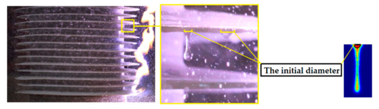 - The initial diameter of the suspended water-drop was the diameter of the contact surface between the water-drop and the lower surface, as shown in Figure 11. It can be seen from the test photos that the initial diameter was in the range of 6 mm to 9 mm and the average value was 7 mm. The diameter of the suspended droplet changed with the intensity of rainfall and surface state; however, it did not affect the discharge significantly.