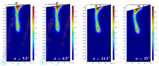 Figure 12. The shape of the suspended water-droplet under different values of slope angle.