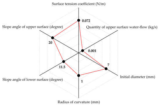 In the solid–fluid coupling simulation, two interfaces of “two-phase and level set laminar flow” and “fluid–solid coupling with fixed geometry” were coupled and solved at the same time by the transient solver with phase initialization. The shape change and motion trajectory of water-droplets could then be obtained. Properties of materials and boundary conditions are also illustrated in Table 3 and Figure 3.