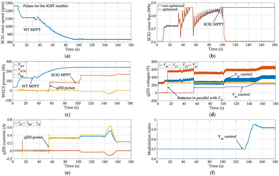 Dynamic responses during the startup procedure: (a) SCIG rotor speed; (b) SCIG rotor flux; (c) WECS powers; (d) qZSI voltages; (e) qZSI currents; (f) modulation index.