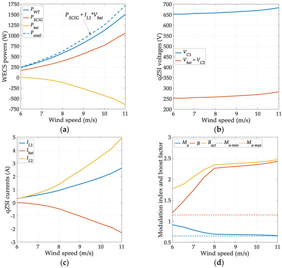 Steady-state characteristics for wind speed variation (Vdc = 400 V, Vac = 230 V): (a) WECS powers; (b) qZSI voltages; (c) qZSI currents; (d) modulation index and boost factor.