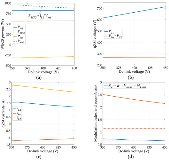 Steady-state characteristics for DC link voltage variation (vw = 9 m/s, Vac = 230 V): (a) WECS powers; (b) qZSI voltages; (c) qZSI currents; (d) modulation index and boost factor.