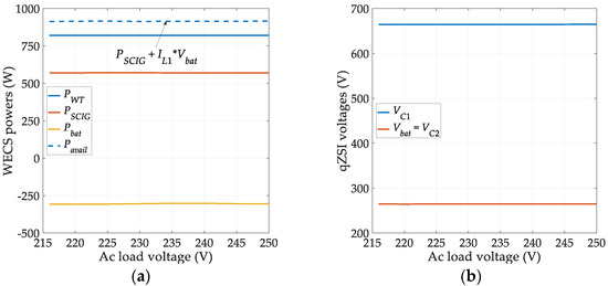 In this case, the wind speed and the AC load voltage were fixed to 9 m/s (medium speed at which there is no D1 blocking during non-ST states) and 230 V, respectively, whereas the DC link voltage was varied as shown in Figure 9. Both the WT power and the SCIG power were unaffected by the Vdc variation, whereas slightly higher battery charging power was recorded at lower Vdc values due to higher battery charging current. Since the qZSI input power was constant in the whole considered Vdc range, the qZSI input current (IL1) decreased with increasing DC link voltage. From the point of view of battery charging or D1 blocking, higher values of the qZSI input current are desirable, but this also implies higher power losses and voltage drops on the parasitic resistances in the impedance network. In addition, too low a Vdc value may result in SCIG demagnetization, especially at higher loads. By increasing the Vdc value, both the voltage across C1 and the voltage across the qZSI bridge also increase. Consequently, the voltage stress and switching losses of the semiconductor switches in the qZSI bridge increase with Vdc. At the same time, the modulation index decreases and eventually reaches the minimum allowed value.