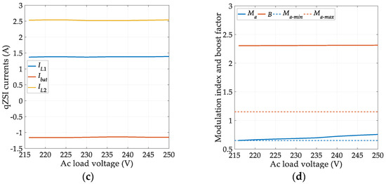 Steady-state characteristics for ac load voltage variation (vw = 9 m/s, Vdc = 400 V): (a) WECS powers; (b) qZSI voltages; (c) qZSI currents; (d) modulation index and boost factor.