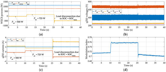 Dynamic responses for the case of minimum SOC: (a) WECS powers; (b) qZSI voltages; (c) qZSI currents; (d) modulation index.