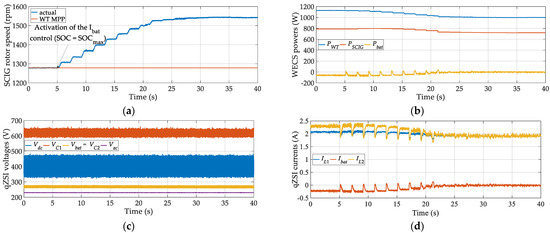 Dynamic responses for the case of maximum SOC: (a) SCIG rotor speed; (b) WECS powers; (c) qZSI voltages; (d) qZSI currents.