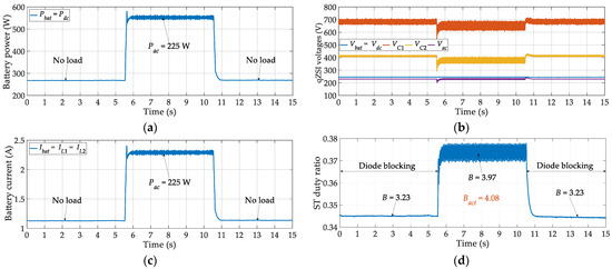 Figure 14 shows the system response to load perturbations for this type of operation. The observation starts in no-load operation, with the batteries only covering the qZSI losses. Due to the relatively low qZSI input current (i.e., Idc = IL1 = Ibat), D1 is blocked during non-ST states in this interval, which is evident from the difference between B and Bact in Figure 14d. The load of 225 W was then applied at t ≈ 5.5 s, causing a small drop in the qZSI voltages and leading to an increase in the qZSI input current. Consequently, the normal non-ST operation with B ≈ Bact was achieved. At t ≈ 10.5 s, the load was removed.