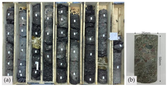 Sample preparation. (a) in situ glutenite formation rocks, (b) a standard core drilled from in situ rocks.