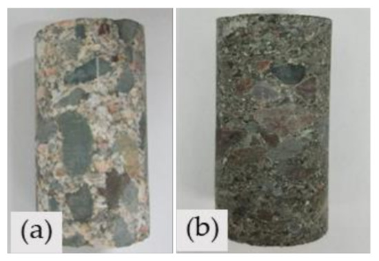 The samples used for experimental tests were obtained from in situ glutenite formation rocks drilled from several wells that belonging to the studying block. According to Figure 1a, in situ laumontite-rich glutenite rocks become loose and fragile after being transported to the ground. By traditional sample drilling method using a core bit, the cores are more easily to be fragmentized, which increases the experimental error. Thus, to lower the mechanical damage caused by core bit, the wire cutting method was introduced to process the rocks into cylindrical shape with a diameter of 25 mm and height of 50 mm, as shown in Figure 1b. The sample coring method we used here was consistent with ISRM suggested methods [14]. In order to ensure the ends of the cores were smooth and parallel to each other in the horizontal direction as well as perpendicular to vertical axial, a polishing machine was used to polish the end face of the samples at both ends.