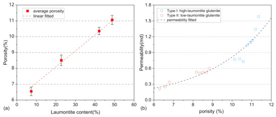 Measured porosity and permeability of glutenite samples containing various laumontite contents. (a) porosity variation with laumontite contents, (b) permeability variation with porosity.