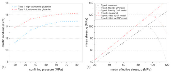 Figure 4a displays the elastic modulus variation with confining pressure. It can be inferred that the elastic modulus of the high laumontite content glutenite rocks is lower than that of the low laumontite content glutenite rocks under the same confining pressure. Another notable feature is that the elastic modulus increases as the confining pressure increases, which reflects a stress-dependent property of laumontite-rich formation. The relationship between yield stress (Mises stress) and mean effective stress from each triaxial test is also depicted in Figure 4b. According to the figure, the mechanical strength of a higher laumontite content sample is also lower than that of a lower content one under the same confining pressure. As for yield criterion, yield stress can be fitted by the linear Drucker–Prager plasticity strength criterion under low confining pressures. When the confining pressure exceeds 50 MPa, the yield stress tends to decrease with the mean effective stress. It can be inferred that the yield stress cannot keep increasing with confining pressure. Therefore, we describe the yield surface by an extended Drucker–Prager model with cap plasticity [17].