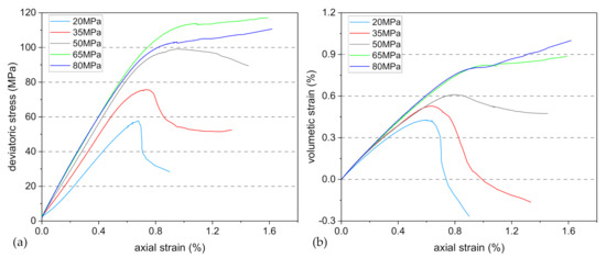 All the stress–strain curves of tested samples are depicted in Figure 5. In order to compare the strain changes under different confining pressures more intuitively, we set the initial strain 0 and the strain formed during the hydrostatic pressure loading process is temporarily subtracted. As shown in Figure 5a, the deformation of studied glutenite samples can also be divided into two stages. Under low confining pressures (20, 35, 50 MPa), it can be seen from the stress-strain curves that stress softening occurs after the peak strength, which indicates an obvious brittle failure. Meanwhile, according to the volumetric-axial strain curves presented in Figure 5b, there is an apparent deflection of volumetric strain after entering the yield stage. After the peak strength, the volumetric strain decreases in the opposite direction as the axial strain increases, and shear dilation occurs. Under the condition of high confining pressure (above 50 MPa), the amplitude of stress increasing with axial strain decreases after yield point, which indicates the characteristics of stress hardening. The volumetric strain of rock continues to increase after the yield point, and shear-enhanced compaction occurs.