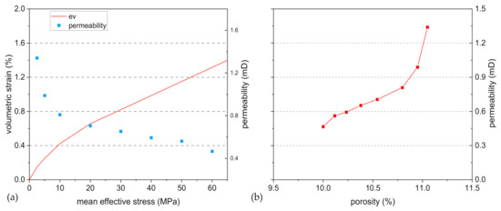 Measured permeability of type I glutenite sample under 65 MPa confining pressure: (a) volumetric strain and permeability variation with mean effective stress, (b) permeability variation with current porosity.