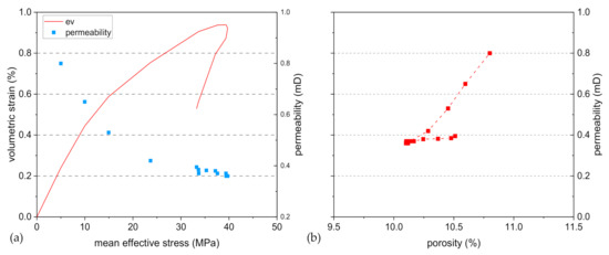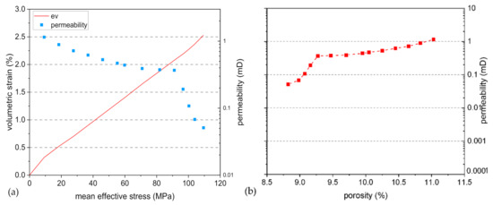 Figure 6 shows the variation of volumetric strain and permeability of rocks in hydrostatic loading experiment. The common perspective is that permeability variation is related to volumetric strain and the porosity variation caused by volumetric strain. Volumetric strain variation is usually related to mean stress variation, while rock shape variation is usually related to deviatoric stress variation [18]. Therefore, our analysis mainly focuses on the relationship among permeability, volumetric strain and mean effective stress. As shown in Figure 6a, as mean effective stress increases, rock pores undergo compression deformation and volume strain increases accordingly. Volumetric strain increases fast when mean effective stress is lower than 20 MPa, which is caused by the closure of microcracks inside rocks at early loading stage. As mean effective stress continues to increase, the increasing rate of volumetric strain first decreases and then remains constant. The variation trend of permeability is consistent with that of volumetric strain. The decreasing rate of permeability remains high when mean effective stress is under 20 MPa and decreases as mean effective stress continues to increase. Figure 6b shows the variation of permeability as porosity increases, and the curve can be fitted by an exponential model. In the whole loading range, the rock is under elastic deformation, so there is no deflection on the volumetric strain curve. In this case, there is little change in pore connectivity and the permeability decrease mainly results from the elastic compression of the pores. Therefore, the decreased permeability is still at the same order of magnitude as the original permeability.