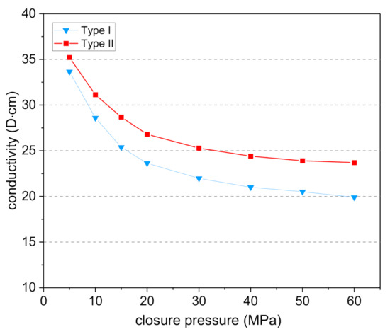The experimental result is shown in Figure 9. It shows that the two reservoir formations have similar conductivity in the low closure stress. The conductivity decreases with the increase in closure pressure, and the conductivity of the high laumontite content glutenite declines more quickly than that of the low laumontite content glutenite. In conclusion, laumontite softens the rock matrix causing the proppant to embed within the rock matrix more easily, which leads to the flow channel narrowing down and conductivity decreasing more severely.