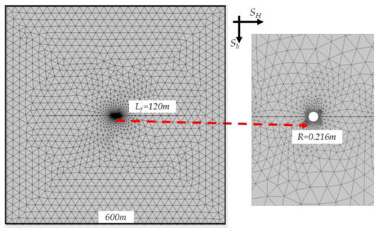 In the simulated works, we have made some reasonable simplifications. Firstly, the simulation is performed under plane strain conditions to reduce computational expense. Secondly, fracture parameters like fracture length and fracture width were already known after fracturing, so the fracturing simulation was not the key point. Fractured well productivity was focused on instead. Finally, based on the previous rock mechanics results, to calculate the stress state and failure condition near wellbore and simplify the whole calculation process, an elasto-plastic constitutive was proposed in the model.