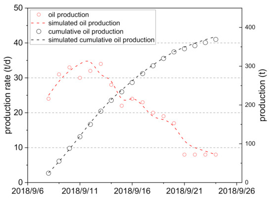 In this study, we applied our model to simulate the production of hydraulic fractured well-1 in the studied area to validate the proposed model. The geometry model and parameters are set according to the actual data of well-1. As shown in Figure 10, a plane strain elastoplastic finite element model is developed. The dimension of the model is 600 m × 600 m. In the middle part of the model, there is a wellbore. The detailed reservoir parameters in the simulation are listed in Table 2. The varying bottom-hole pressure is applied according to field data as the oil nozzle is adjusted during the well testing, which is shown in Figure 11.