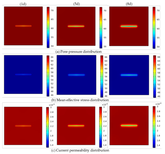 Simulated (a) pore pressure distribution, (b) mean effective stress distribution, (c) current permeability distribution of different production time (1 day, 5 days and 8 days).