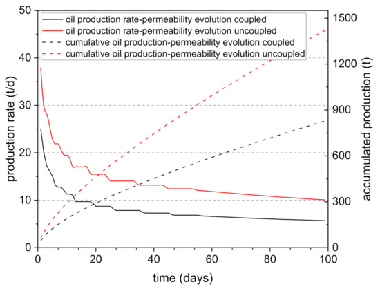 Oil production rate and cumulative oil production variation with production time for induced permeability evolution, coupled and uncoupled.