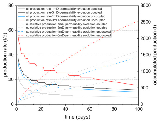 To analyze how initial permeability influences productivity, the initial permeability was set 1 mD and 3 mD in the production simulation. As shown in Figure 15, the simulated oil production rate of the models with higher initial permeability is larger than that with lower permeability for permeability evolution coupled and uncoupled models. Therefore, initial permeability is one of the ways that laumontite affects the productivity in this area. What is worth noting is that when permeability evolution is considered, the productivity difference caused by the initial permeability will reduce. Actually, glutenite formation with higher laumontie content commonly has a more severe stress sensitivity in permeability, so the productivity difference will be further reduced.