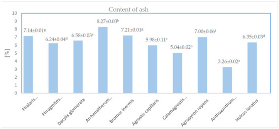 The contents of ash in the studied grass species are given in Figure 1. The levels of these compounds were relatively varied, ranging from 3.26% in the case of sweet vernal grass to 8.27% in false oat-grass. Large amounts of ash (7.00–7.21%) were recorded in three more species: Agropyron repens, Phalaris arundinacea and Bromus inermis. Calamagrostis epigejos had a 5.04% ash content. The ash contents in Phragmites australis, Holcus lanatus, Dacylis glomerata and Agrostis capillaris were comparable, in the range 5.98–6.58%.
