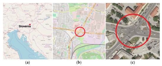 Detailed location and situation of investigated intersection: (a) location of Slovenia and Celje (marked with a red dot); (b) map of Celje with the main roads and observed intersection; (c) photo of the intersection of the study where the city traffic management and vehicle density were investigated. (based on map source: © OpenStreetMap (a,b) and Municipality of Celje (c)).