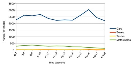 Thus, Table 2 represents the sum of vehicles crossing our observed intersection according to the vehicle type in one counting day. However, in wintertime (opposite to June when counting was performed), a higher number of cars is expected due to a lower number of bicycles and motorcycles which are rarely seen during cold, rainy or snowy days. This means that the observed period characteristics encompass a low number of cars for a working day. In subsequent parts of the article, calculations will be focused on an hourly time interval between 6:00 and 18:00. This interval is associated with the most intensive traffic density in one day; Figure 4 illustrates the traffic density in an observed working day.
