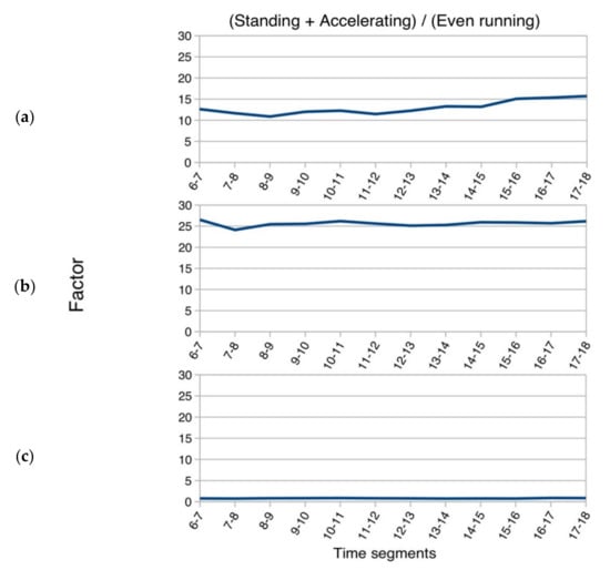 Figure 6 shows the ratio presenting how many times more standing and accelerating traffic costs (considering fuel consumption or CO2 production) compared with even running when driving through the intersection under investigation. The quantification was carried out for all vehicles (see graph (a)), cars only (see graph (b)), and, in the event of no stopping traffic, for vehicles travelling in the main traffic directions (see graph (c)).