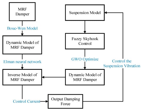 Regarding semi-active control, the fuzzy skyhook control method is a suitable control method for the MRF damper. However, the selection of key parameters Ka, Kv, and Ku in fuzzy control is not accurate and mainly depends on experience. Therefore, to address this problem, this study optimized fuzzy control to obtain a better suspension damping effect. The schematic of the research workflow is shown in Figure 1.