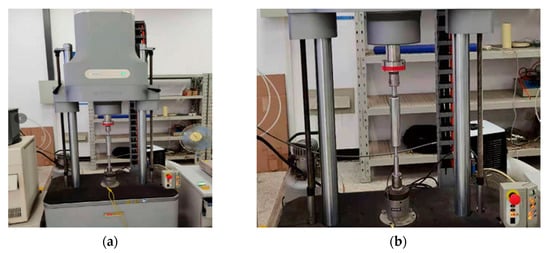 Damping characteristics test of the magnetorheological fluid damper. (a) Instron E10000 electronic dynamic testing machine; (b) MRF damper installed on the dynamic testing machine.