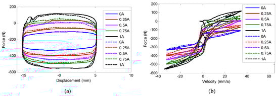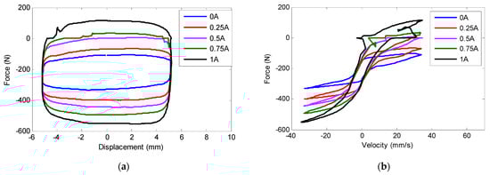Damping characteristic diagram of the MRF damper (a): the displacement–force characteristic curves for different control currents under the harmonic excitation of 5 mm amplitude and 1 Hz frequency; (b) the velocity−force characteristic curves for different control currents under the harmonic excitation of 5 mm amplitude and 1 Hz frequency.