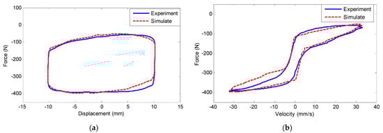 To verify the model identification results, the simulation results were compared with the test data under different currents as shown in Figure 7. In the Figure 7, the experimental data are shown as solid lines and the simulation results are dotted lines. In the Figure 7, we can see that the calculated displacement–force curve and the velocity–force curve by the Bouc-Wen model identified in the article are good and consistent with the experimental result.