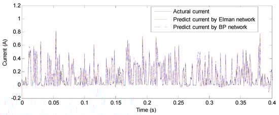 The predicted values of the current using the Elman and back propagation (BP) networks.