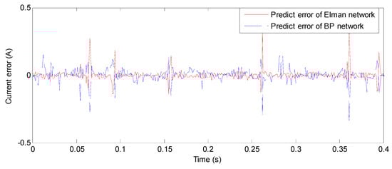 Figure 11 shows the original current and the predicted control current using the Elman and BP neural networks, and Figure 12 shows the error comparison of the control current using the Elman and BP neural networks. From the prediction results and error comparison given in Figure 11 and Figure 12, the fitting effect of the control current predicted by the Elman neural network to the original current sample was higher than that of the BP network, and the root mean square (RMS) value of the Elman neural network prediction error was 0.0236, which was less than that of the BP neural network. The prediction error of BP network was 0.0301. In addition, the fitting error using Elman neural network was reduced by 21.59%, which indicates that the Elman neural network inverse model has better performance.