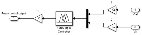 As shown in Figure 13, the inputs of the fuzzy control were Vrel and Vs, and the discourse domains of the input variables were set as [−1, 1]. The output was set as [0, 1], and then the output was multiplied by the scale factor, Ku, to obtain the fuzzy control output. The control rules and reasoning mechanism of a designed fuzzy controller cannot be adjusted, but the quantization factors Ka and Kv and the scale factor, Ku, can be adjusted, and have significant influence on the controller performance.
