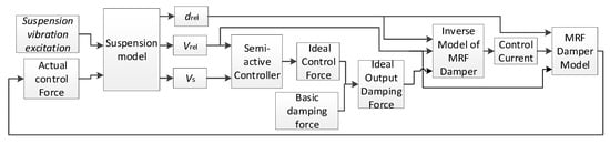 After the control force is obtained by the optimized fuzzy skyhook method, the semi-active control force is summed with the basic damping force of the MRF damper to obtain the ideal output damping force. Then the ideal output damping force, the relative velocity Vrel, and relative displacement drel are simultaneously updated to the inverse model of the MRF damper to obtain its control current to realize the semi-active control. The control flow is shown in Figure 14.
