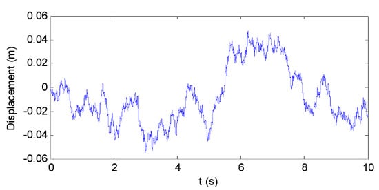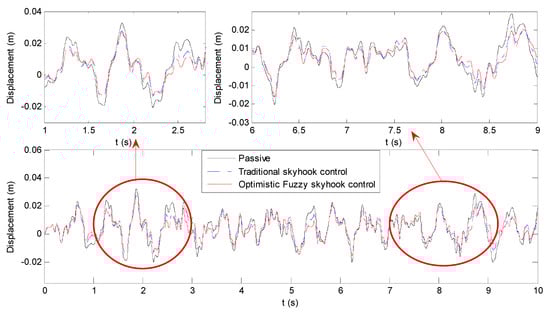 The C class road excitation according to ISO 8608: 2016 [30] was used in this section as shown in Figure 15. The passive vibration reduction method, the traditional skyhook control method, and the optimized fuzzy skyhook method were simulated and compared after optimization using the GWO method. The optimized fuzzy control parameters were Ka = 9.82, Kv = 3.11, and Ku = 1.10. The passive damping method was used such that the current output of the MRF damper was always zero, and the suspension damping could not be changed in the passive vibration reduction state. The traditional skyhook control method used the approach described in Equation (7) to control the vibration.