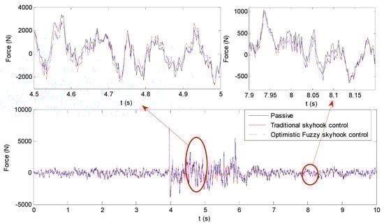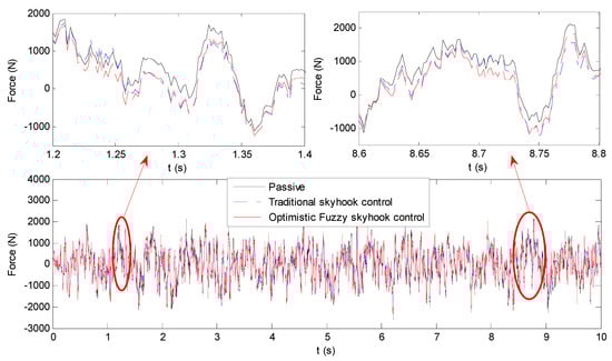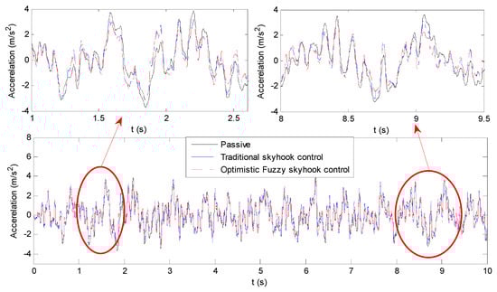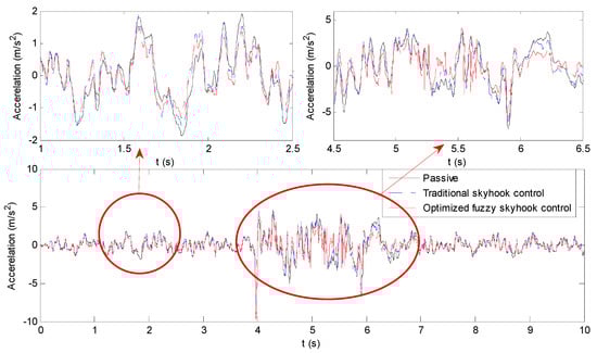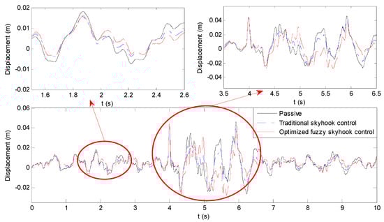 The time histories and RMS values of the vertical acceleration, suspension dynamic deflection, the tire dynamic load under the passive state, the traditional skyhook control, and the GWO fuzzy skyhook control are shown in Table 4 and Figure 16, Figure 17 and Figure 18.