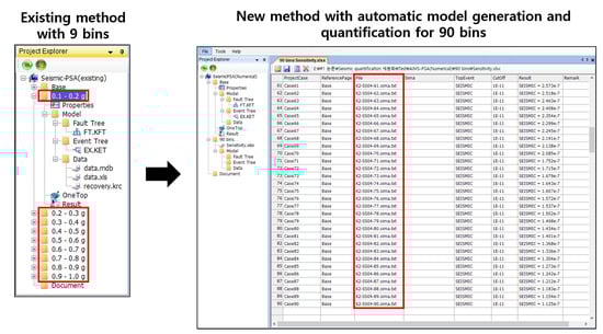 A software tool implementing the aforementioned method is developed to assist the seismic PSA quantification. Figure 2 compares the existing method and the novel method utilizing the software tool when the seismic PSA model is developed using AIMS-PSA. AIMS-PSA [14] is one of the most widely used PSA modeling and quantification packages in Korea. In the existing method, the ground motion level from 0.1 g to 1.0 g is divided into nine bins, and separate seismic models for the bins are developed, usually manually, to quantify the seismic risks for the bins.
