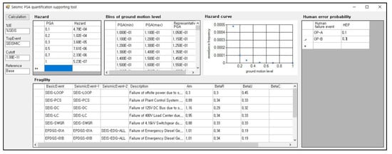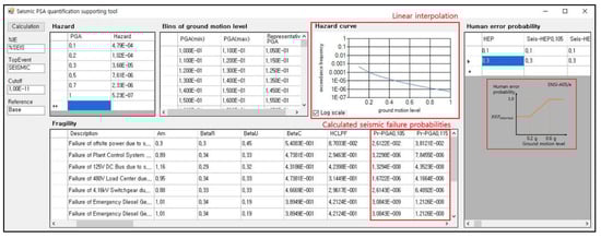 Figure 3 and Figure 4 show the user interface of the software tool. It is assumed that the hazard analysis and fragility analysis are finished and the hazard data points and seismic fragility data of SSCs are provided by seismic analysis experts. Because seismic PSA is performed based on given seismic hazard curve and fragility curves, the application of the proposed method and software tool is not affected by how the hazard and fragility curves are obtained. The software tool receives the hazard data points, user-defined ground motion level intervals, and seismic fragility data of SSCs and base HEPs. The seismic hazard curve is constructed with hazard data points by applying linear interpolation on a semi-log scale. Ground motion level bins are defined according to the user-defined ground motion level intervals. The seismic fragility data of the SSCs include the median capacity and the two uncertainty variabilities: one for the inherent randomness () and the other for modeling uncertainty (. Seismic failure probabilities of the SSCs are calculated based on the seismic fragility data and the representative ground motion level of the bins. HEPs for the bins are calculated with the base HEPs and user-defined rules for adjusting HEPs under seismic events. Figure 4 shows the case where ENSI guidance is applied.