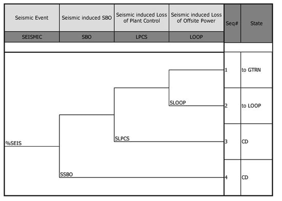 A primary seismic event tree is shown in Figure 5. The seismic fragility data for the primary seismic event tree are provided in Table 2. In Sequence 4, the occurrence of any of the three events leads to the failure branch. The sequences for GTRN and LOOP, that is, Sequences 1 and 2, are connected to corresponding secondary event trees that are adopted from the pilot plant PSA model for internal events with additional seismic failures of SSCs.
