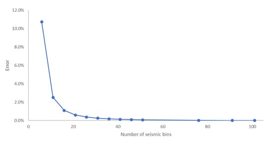 As the number of bins increases, the quantification results become more accurate. The sequence frequencies of Sequences 3 and 4 in Figure 5 calculated with the support of the software tool and the use of 101 seismic bins are 2.11 × 10−6 and 5.65 × 10−6 per year, respectively, where those calculated with an alternative seismic PSA quantification method are 2.11 × 10−6 and 5.66 × 10−6 per year, respectively. When 101 seismic bins are used for quantification, the core damage frequency is calculated to be 8.779 × 10−6 per year. The error in Figure 6 is defined as the difference between the quantification results for the number of seismic bins and 101 seismic bins divided by the quantification result for 101 seismic bins. Figure 6 depicts how the errors in quantification results change as the number of bins increases. From the error of 10.7% when six bins are used, the error gradually decreases and approaches zero as the number of bins increases. Figure 6 quantitatively shows how the quantification results approach the accurate quantification results as the number of bins increases. If more seismic failures of SSCs are considered, the errors in case of small numbers of bins are expected to be greater than those shown in Figure 6, where the errors related to the seismic failures of only seven SSCs are considered.