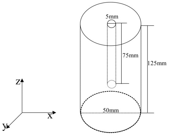 In this paper, we conducted a hydraulic fracturing experiment on a sandstone sample from the Yanchang-6 formation in the Ordos Basin. According to the experimental standard of rock mechanics, the ratio of length to width of the rock sample was 2.5:1, the diameter was 50 mm, and the standard cylindrical core was 125 mm long. Considering fluid injection, we made a cylindrical hole (diameter, 5 mm; length, 75 mm) in the center of the studied rock sample, as shown in Figure 1.
