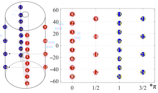 Distribution of piezoelectric transducer sensors mounted on the surface of the test sample. PZT 1–12 (the red dot) indicates ultrasonic wave emission sensors, and PZT 13–24 (the blue dot) served as the receiving probes. An expanded view of the lateral cylinder is showed in the cylindrical coordinate system.
